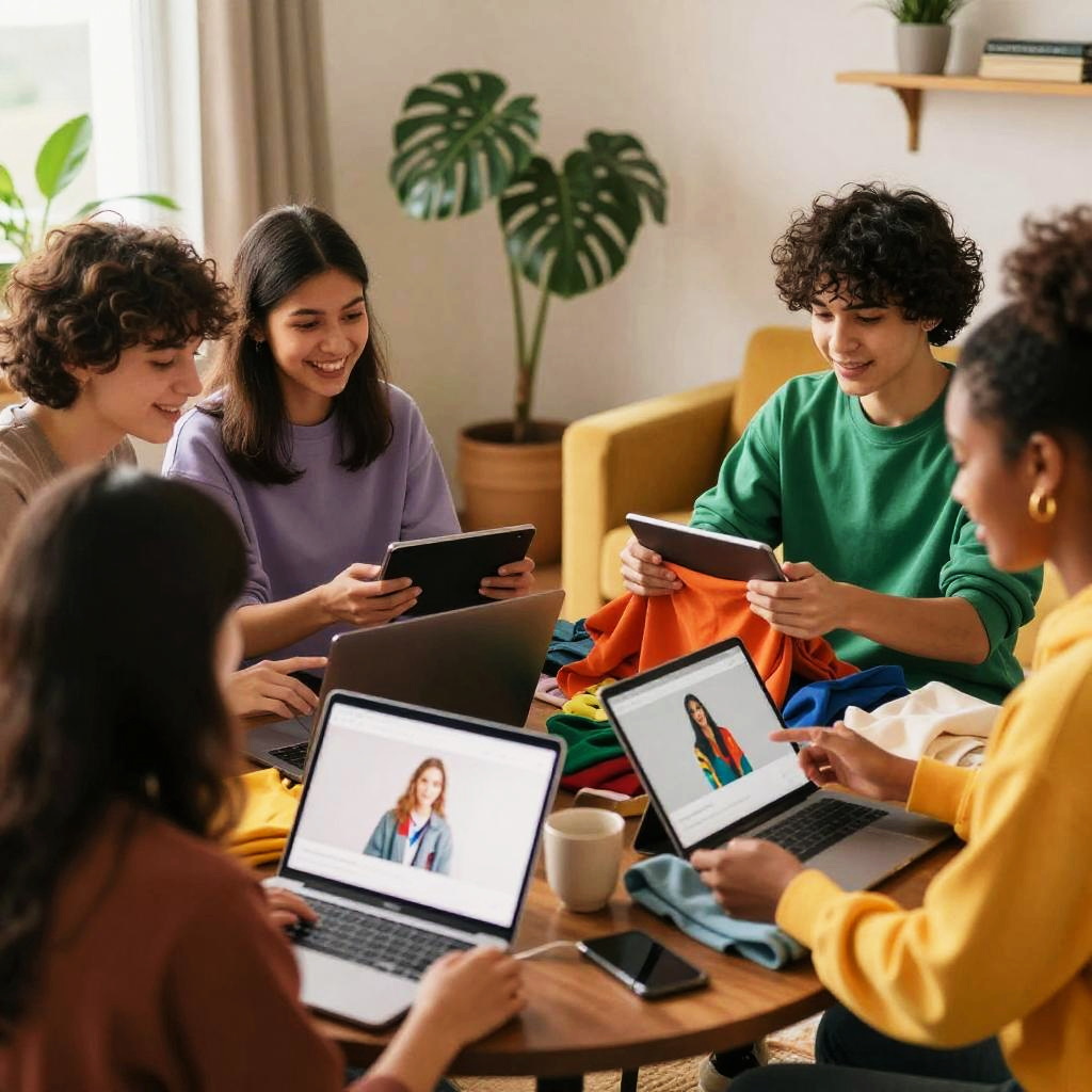 Clothes swap online community, group of friends sharing clothes using tablets and laptops, cozy indoor setting with plants and warm lighting, colorful and trendy clothing styles, interactive digital elements, vibrant and optimistic atmosphere