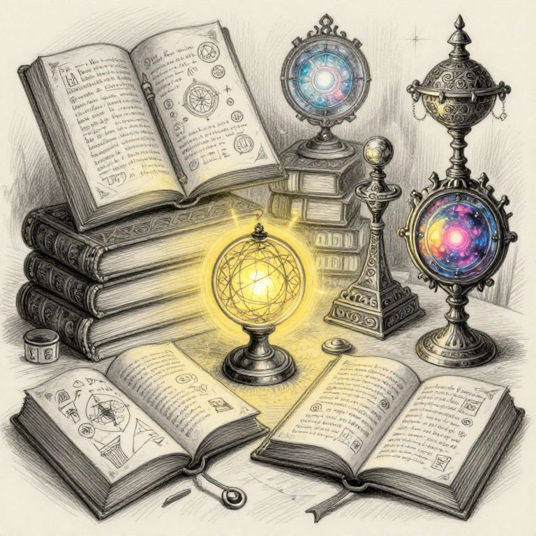Illustration of open magical books, glowing orbs, and ornate lamps, with detailed ink drawings and vibrant colored lights, creating a mystical atmosphere.