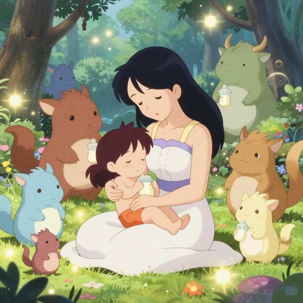 Mommy anime girls in a serene garden, wearing floral dresses, long flowing hair, holding babies or toddlers, sunlight filtering through leaves, delicate linework, vibrant colors, a sense of peace and nurturing, detailed nature elements in anime style.