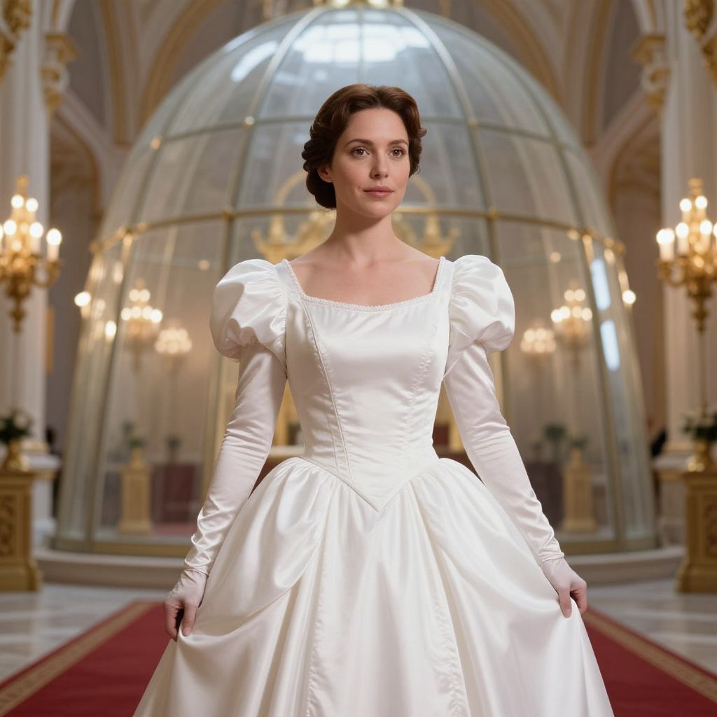 Photograph of a fair-skinned woman with brown, wavy hair in a vintage updo, wearing a white, long-sleeved, satin ball gown with puffed shoulders and a square neckline. She stands confidently in an opulent, grand hall with a glass dome ceiling, ornate chandeliers, and marble columns. The background features a red carpet and golden accents, creating a luxurious setting. The woman's expression is calm and poised, and she wears white gloves that match her dress. The image has a soft, warm lighting that enhances the elegant atmosphere.