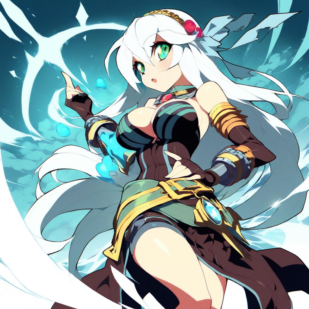 Alchemist (ragnarok online), ragnarok online, 1girl, long hair, large breasts, medium breasts, cleavage, elbow gloves, fingerless gloves, by artist sawayaka samehada, animagine