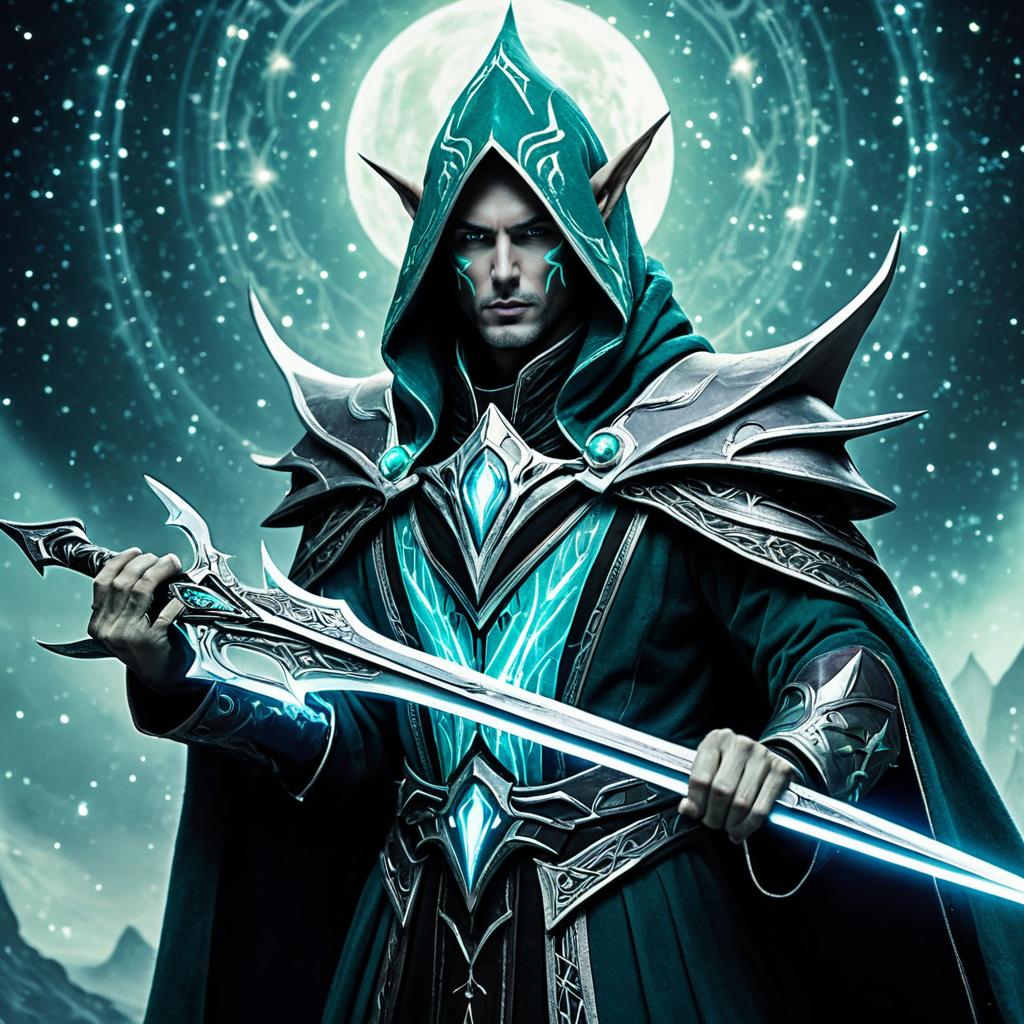 Elegant portrait of an Aeldari (Eldar) Farseer, wearing glowing spiritweave cloak, holding a shimmering ghostblade, against an ethereal astral plane.