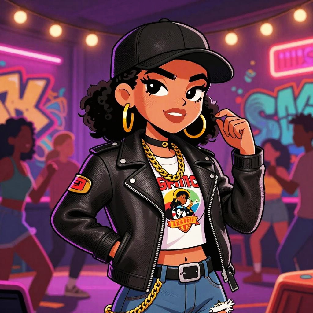 Reimagined cartoon antihero as a playful biracial female BMX rider at lit-up nighttime city plaza with colorful billboards, rendered in neon-infused illustration with smooth gradients and crisp lines; energetic mischievous attitude; detailed clothing and accessories (puffer vest, graphic leggings, high-top sneakers, fingerless gloves); dynamic pose with low-angle framing; graffiti tags and stickers on walls; saturated colors and bold contrasts; crisp linework and halftone textures; soft rim light and subtle motion lines; shallow depth of field; digital illustration; ultra-detailed urban vibe.