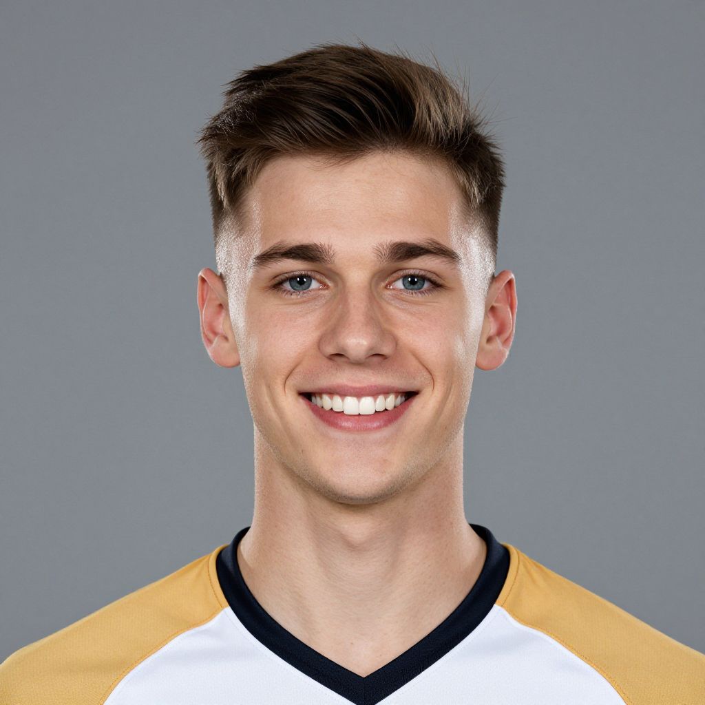 A photographic portrait of a young caucasian man smiling with short brown hair that sticks up in the front, blue eyes, groomed eyebrows, tapered hairline, sharp jawline, wearing a volleyball jersey, sigma 85mm f/1.4, 15mm, 35mm, 4k, high resolution, 4k, 8k, hd, full color