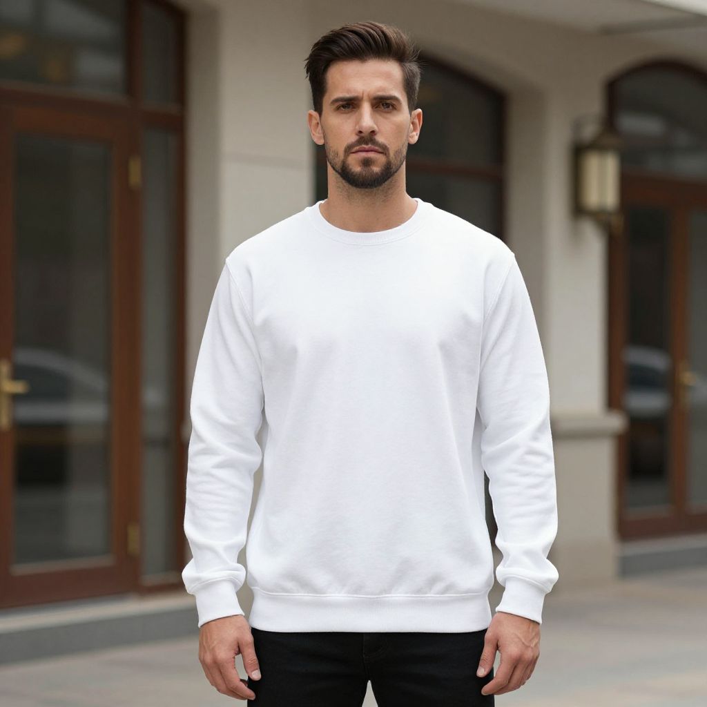 "White Sweatshirt Man Costume, man in white shirt standing in front of a building"