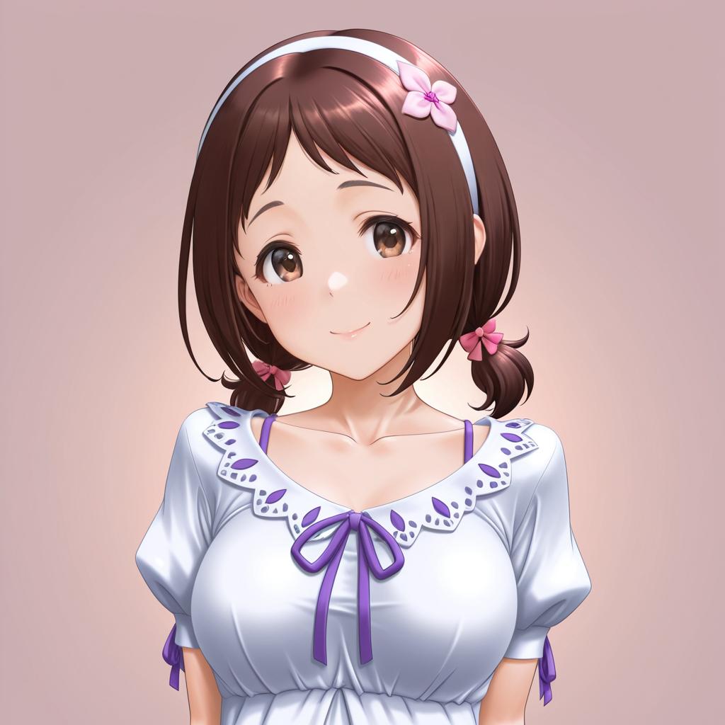 Muramatsu sakura, idolmaster, 1girl, pink eyes, brown eyes, eyebrows, brown hair, short twintails, hairband, by artist t2r, dark_illustrious
