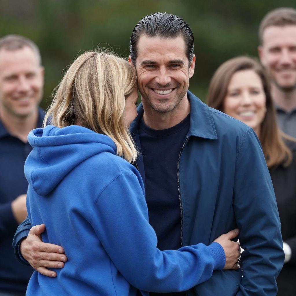 Four men embracing and smiling in a warmly lit yellow-walled room. One man in a black cap stands in the center with his arms around two men in blue shirts, one with a beard and one with blond hair. A fourth man with a beard smiles in the background. The scene conveys friendship and camaraderie.