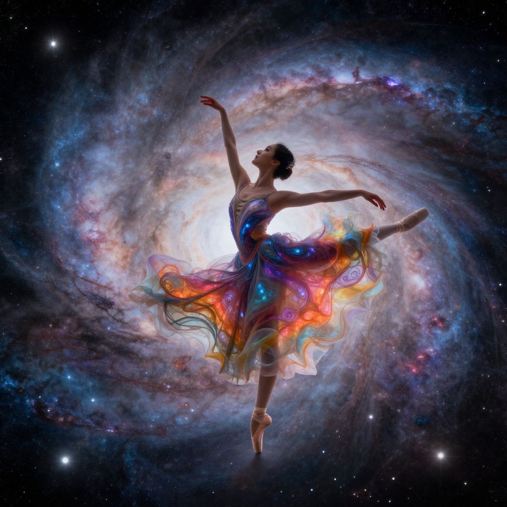 A celestial dancer pirouettes gracefully across a nebulous cosmos, her iridescent gown blending seamlessly with the swirling colors of the galaxy. This mesmerizing digital artwork masterfully fuses classical ballet's elegance with the ethereal beauty of interstellar space, as viewed from an otherworldly perspective that highlights this unique fusion. The celestial ballet transcends time and place, evoking a sense of wonder and reverence for the interconnectedness of art and nature, while intricate patterns and vibrant hues of her gown tell a story of cosmic creation and transformation with every movement.