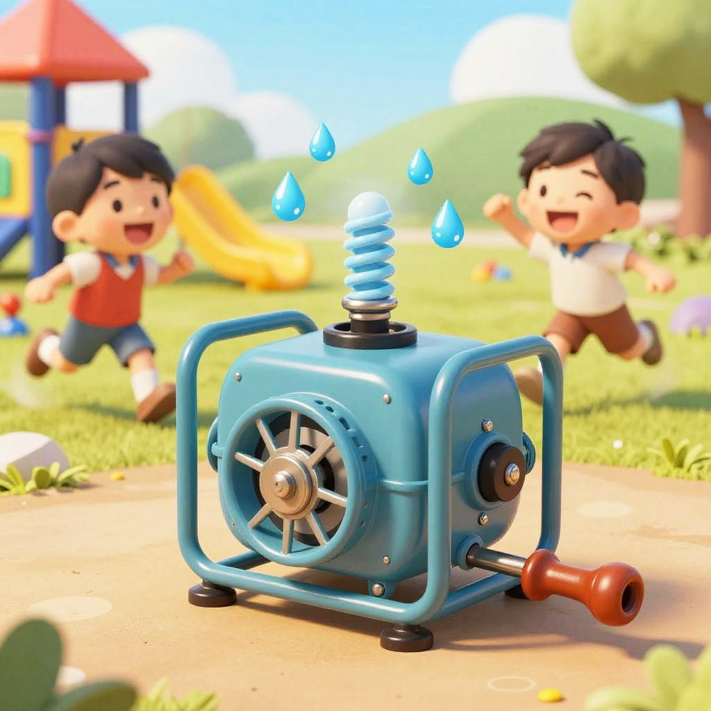 Generator cartoon illustrating an old-fashioned hand-crank generator, with exaggerated crank handle, animated sweat droplets, kids happily generating electricity in a colorful playground, bright, cheerful palette with expressive faces and motion blur effects.