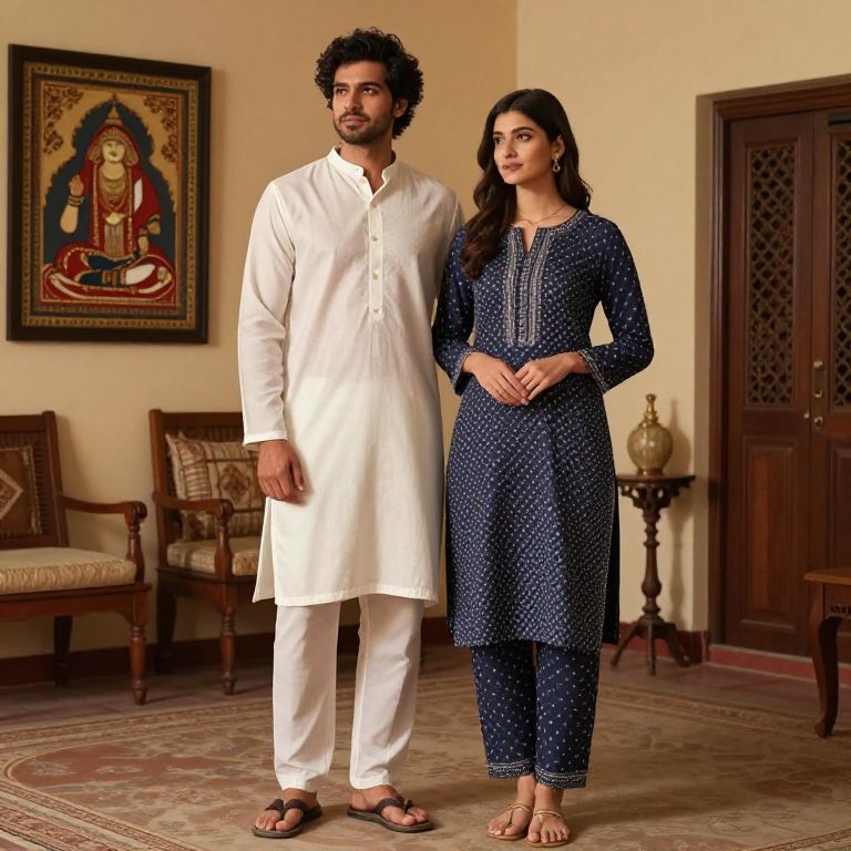A fashionable kurta pajama outfit in contemporary design, blending traditional patterns with minimalist cuts, worn by a young couple in a heritage villa, surrounded by Indian artwork and wooden furniture, warm ambient lighting, lifestyle photography vibe, Dall-E style.