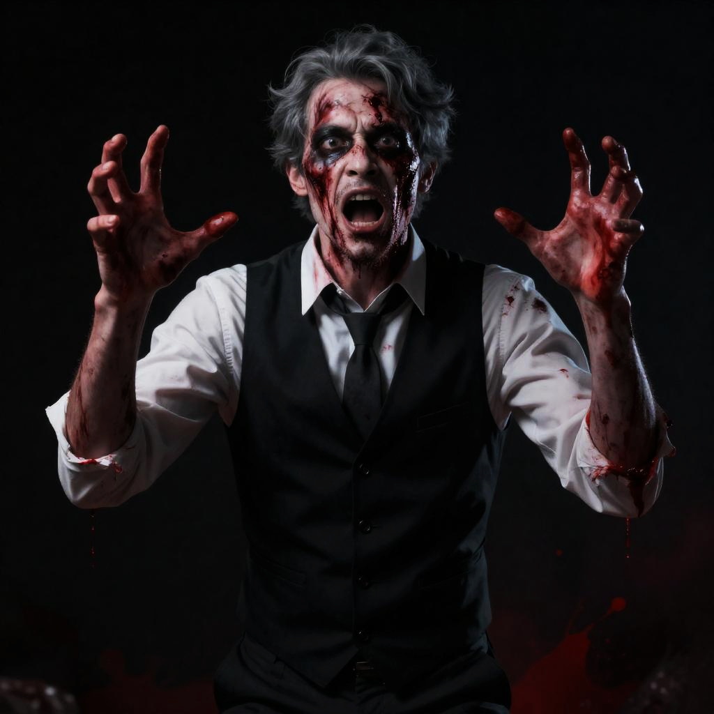 Zombie man with bloody face and exposed chest wearing plaid shirt, standing in dimly lit bedroom. Two bedside lamps on wooden headboard. Bed with rumpled blue blanket in background. Zombie's arms outstretched, mouth open in snarl.
