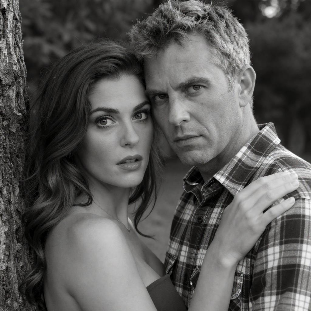 Black and white photograph of a man with slicked-back hair and a denim jacket, pointing a gun at the camera, smiling intensely. A woman with curly hair and a white dress leans into him, looking surprised. Background includes parked cars and trees. Man on the left, woman on the right.