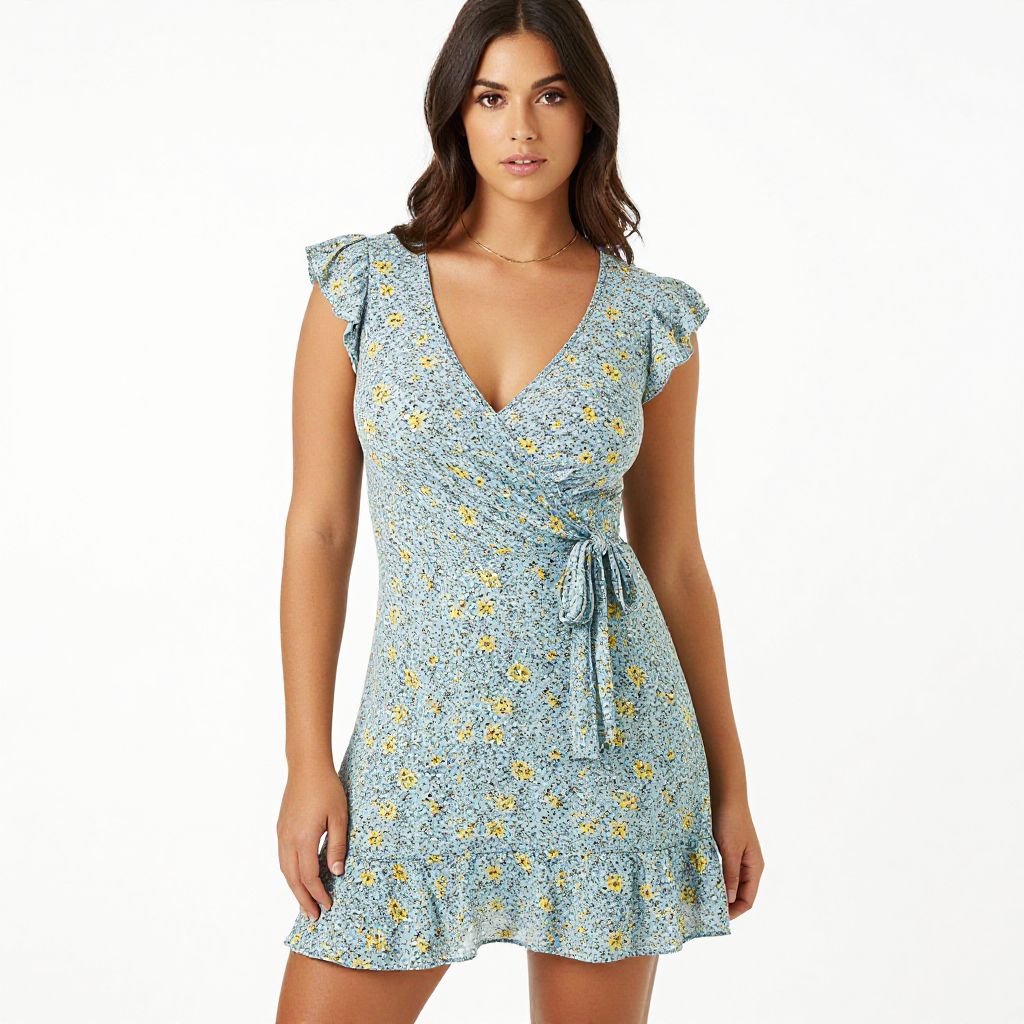 "Woman, summer casual, short A-line dress in light blue with small yellow and black floral print, V-neckline, flutter cap sleeves, wrap front with side tie, above-knee length with flounce hem, delicate gold necklace, white background. Sexy. Pretty face and beаutiful eyes. Big breasts."