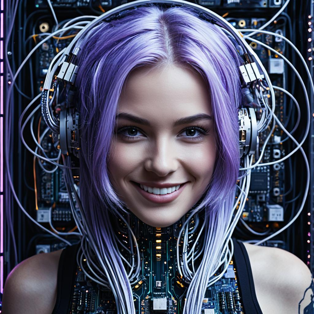 Portrait of a smiling, beautiful male android with silver hair, missing panels exposing electronics and circuitry, intricate and abstract wire management, sci-fi concept art, octane render, hyperrealism, portrait photograph style, Nikon quality
