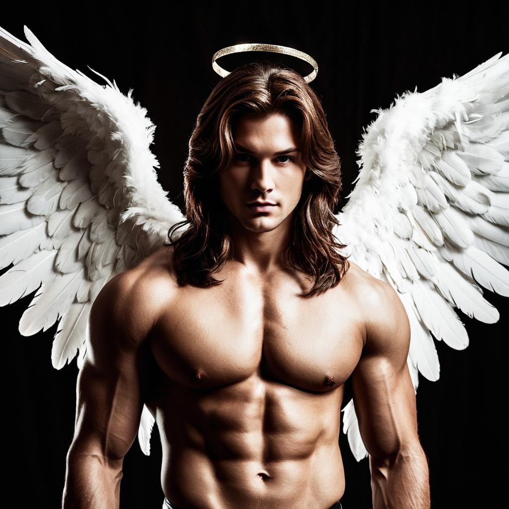 A muscular young man with long brown hair poses shirtless against a black background. He wears large, white feathered angel wings and a glowing halo above his head, looking directly at the viewer with a serious expression. The image portrays a realistic and detailed depiction of an angel figure with strong, defined muscles.