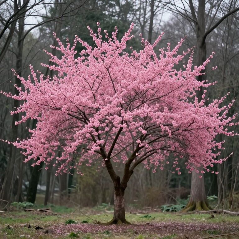 Photograph of a single cherry blossom tree in full bloom, with vivid pink flowers densely covering its branches. The tree stands alone in a forest setting, surrounded by leafless, tall trees with dark brown trunks. The forest floor is covered in grass and scattered fallen leaves. The background is slightly blurred, emphasizing the cherry blossom tree in the foreground. The sky is overcast, casting a soft, diffused light over the scene. The overall composition highlights the contrast between the bright pink flowers and the dark, muted forest.