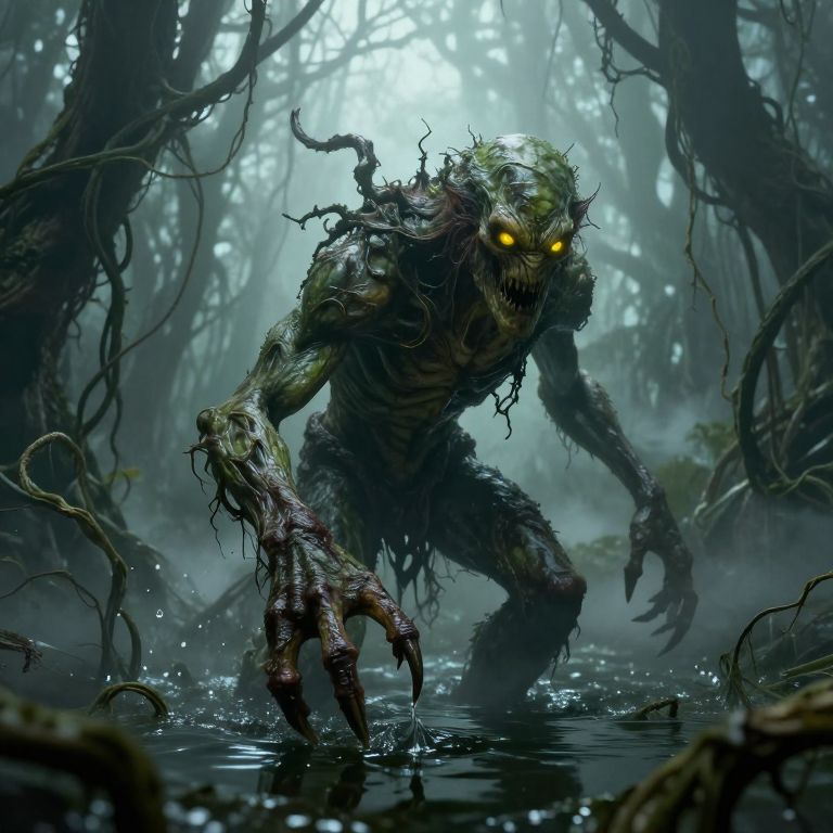 Horro creature lurking in misty swamp, slimy green skin, glowing yellow eyes, sharp claws breaking through murky water, twisted vines, dense fog surrounding, terrifying silhouette, intense suspense, detailed monster design, horror fantasy environment