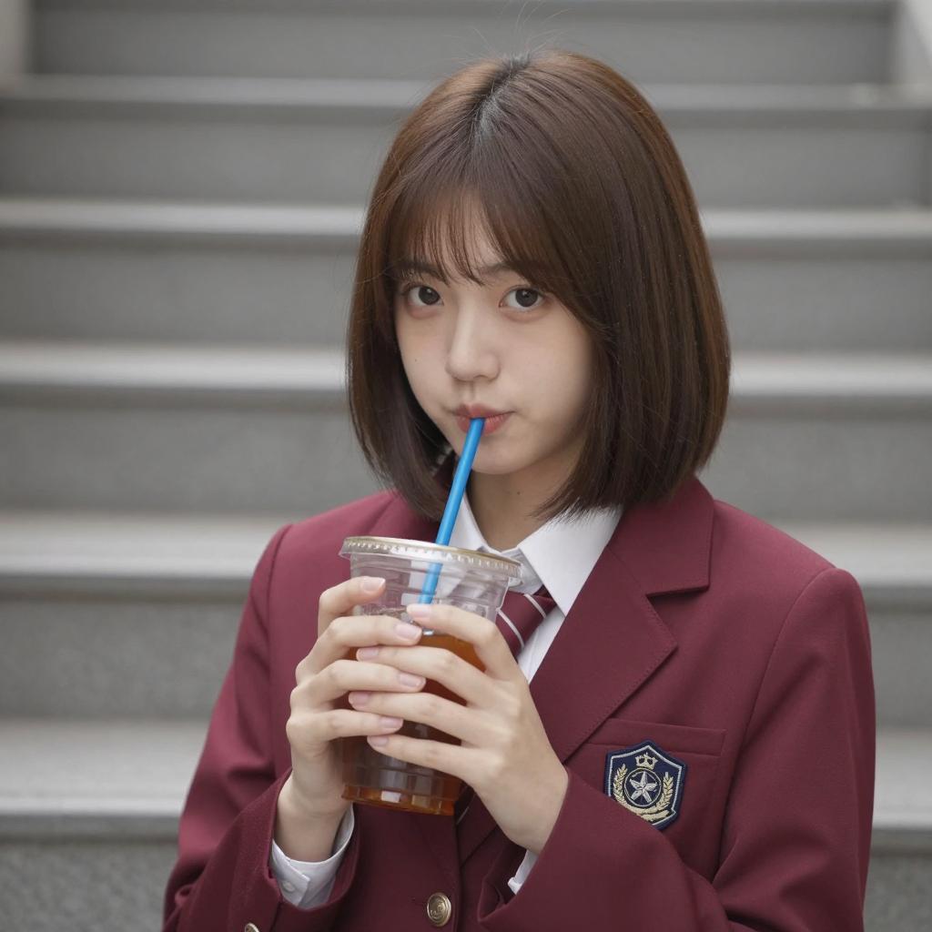 Asian woman with long brown hair and bangs wearing a white short-sleeve shirt, drinking Suntory Whisky directly from a bottle. She is seated at a wooden table with a glass of whisky in front of her, inside a cafe or bar with a visible chalkboard menu and modern decor suggesting a Japanese setting.
