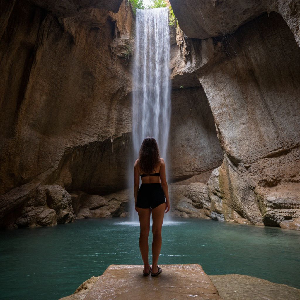 Photograph of a woman with long, dark hair standing on a rock platform at the base of a tall, narrow waterfall. She is seen from behind, wearing a black bikini. The waterfall cascades down a rugged, brown rock formation into a calm, turquoise pool. Sunlight filters through the opening at the top of the rocks, illuminating the falling water. The rock walls are textured and jagged, contrasting with the smooth water. The scene is serene and natural, capturing the woman's contemplative moment in a secluded, cave-like environment.