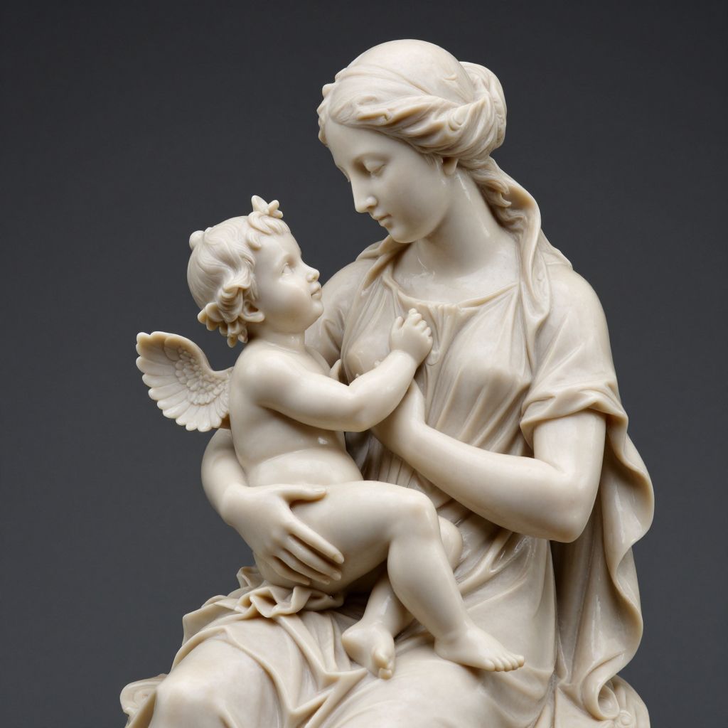 KPM Rubenesque sculpture depicting a serene woman tenderly cradling a cherubic child, both rendered in creamy porcelain with intricate details highlighting their graceful interaction.