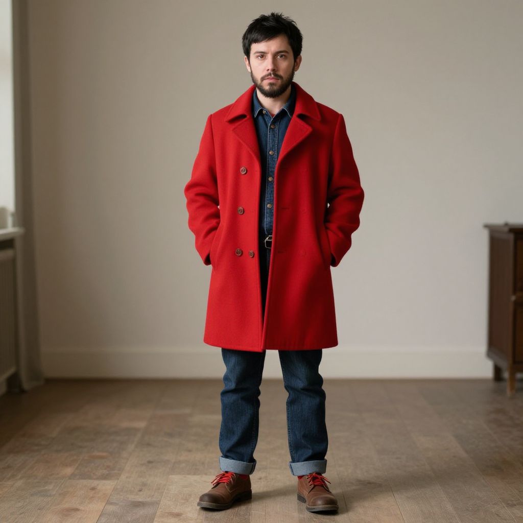 Red coat man, 1boy, male focus, solo, pants, hands in pockets, coat, indoors, facial hair, meme, denim, black hair, full body, standing, shoes, jeans, red socks, parody, aura, brown footwear, jacket, buttons, shirt