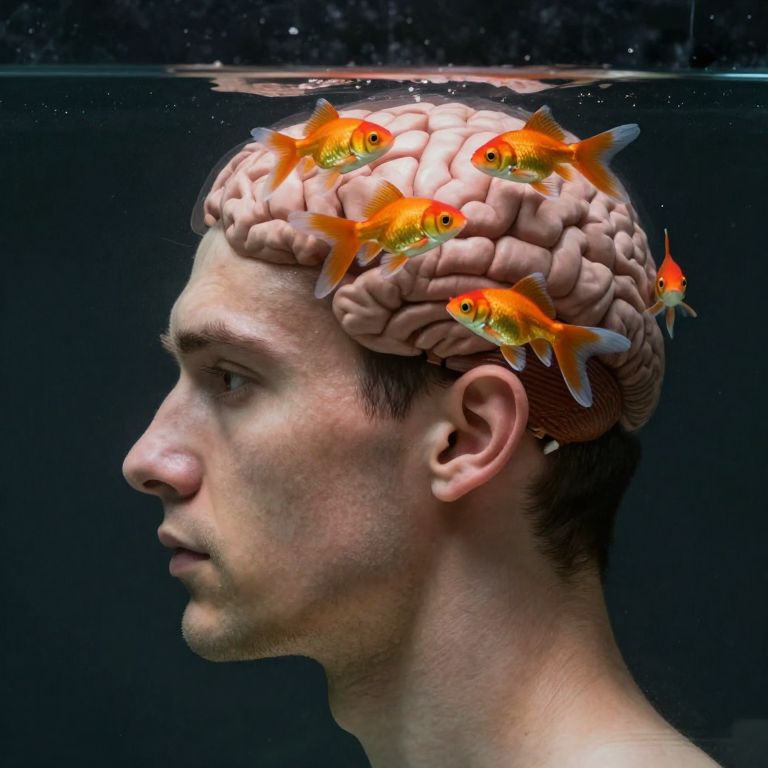 A surreal image of a man's head with goldfish swimming through his brain, creating a double exposure effect.