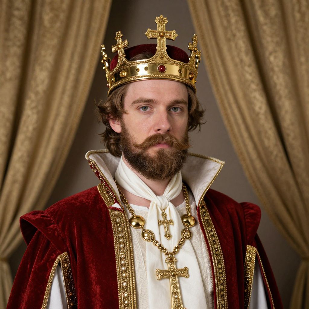 Photograph of a bearded man with fair skin and brown wavy hair, wearing a gold crown adorned with red gems and a large cross. He dons a rich, deep red velvet robe with intricate gold trim over a white, high-collared shirt. A large gold cross necklace hangs around his neck. The background features heavy, golden-brown curtains, creating a regal and solemn atmosphere. The man's expression is serious and composed, looking directly at the camera. The image has a historical, royal portrait style.