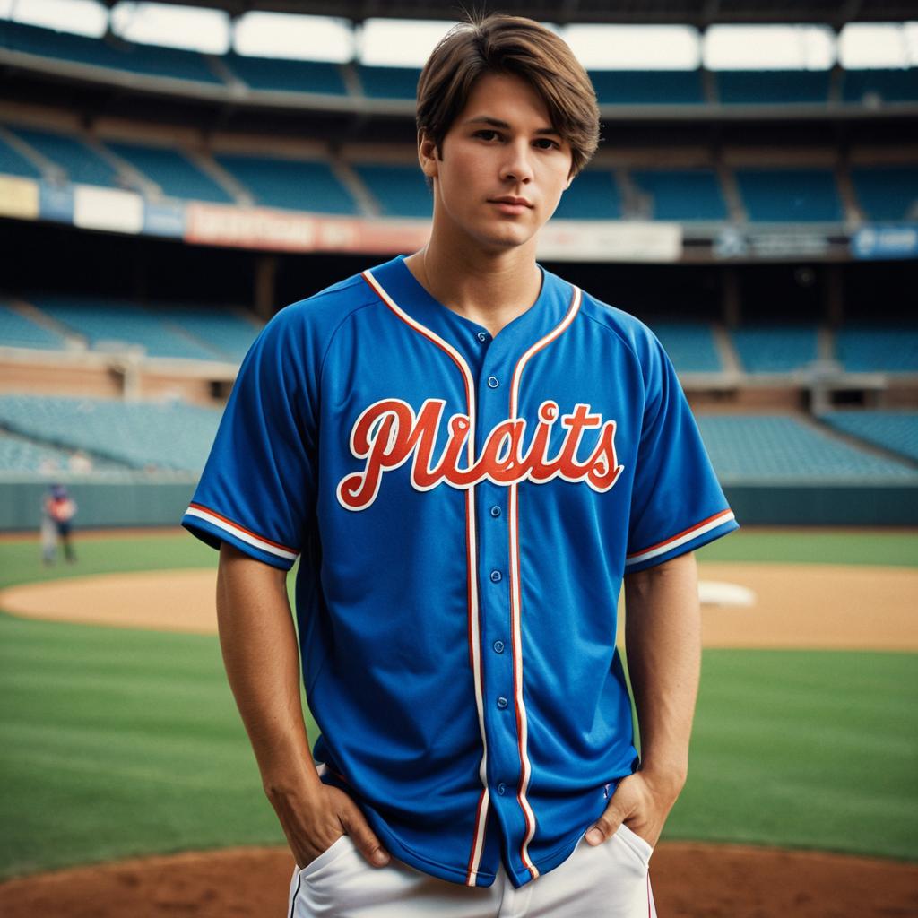 Hockey fan costume,1boy, male focus, realistic, brown hair, solo, gloves, looking at viewer, stadium, shirt, pants, standing