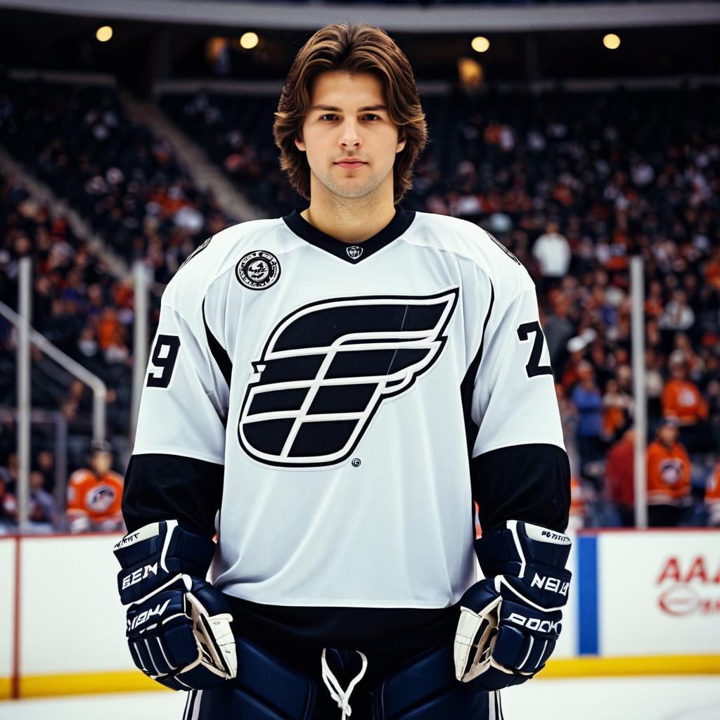 Portrait of a young male hockey player with brown hair wearing a white jersey with a black winged logo, matching gloves, and protective gear standing in an ice hockey arena. The stadium is filled with spectators blurred in the background.