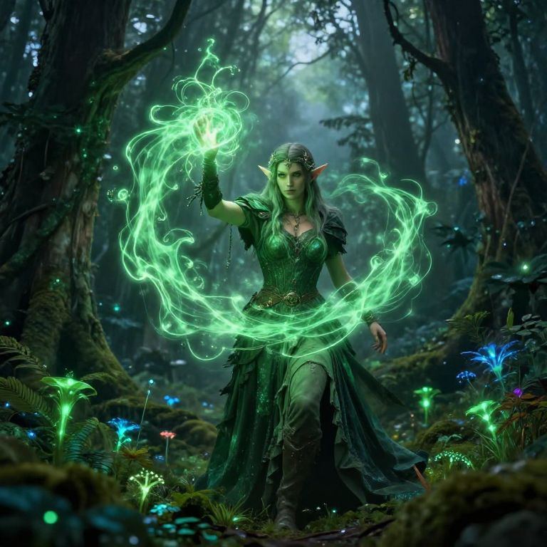 Forrest elf mage casting a luminous spell with green energy swirling, deep in an enchanted forest filled with bioluminescent plants and soft magical fog