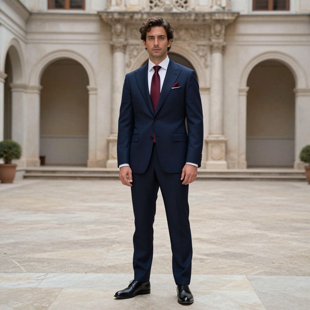 A man, tailored navy blue Italian suit, crisp white dress shirt, silk burgundy tie, polished black leather dress shoes, subtle pocket square detail, historic building, ornate architecture, tranquil courtyard, medium format film, confident expression. Man has masculine face and piercing eyes