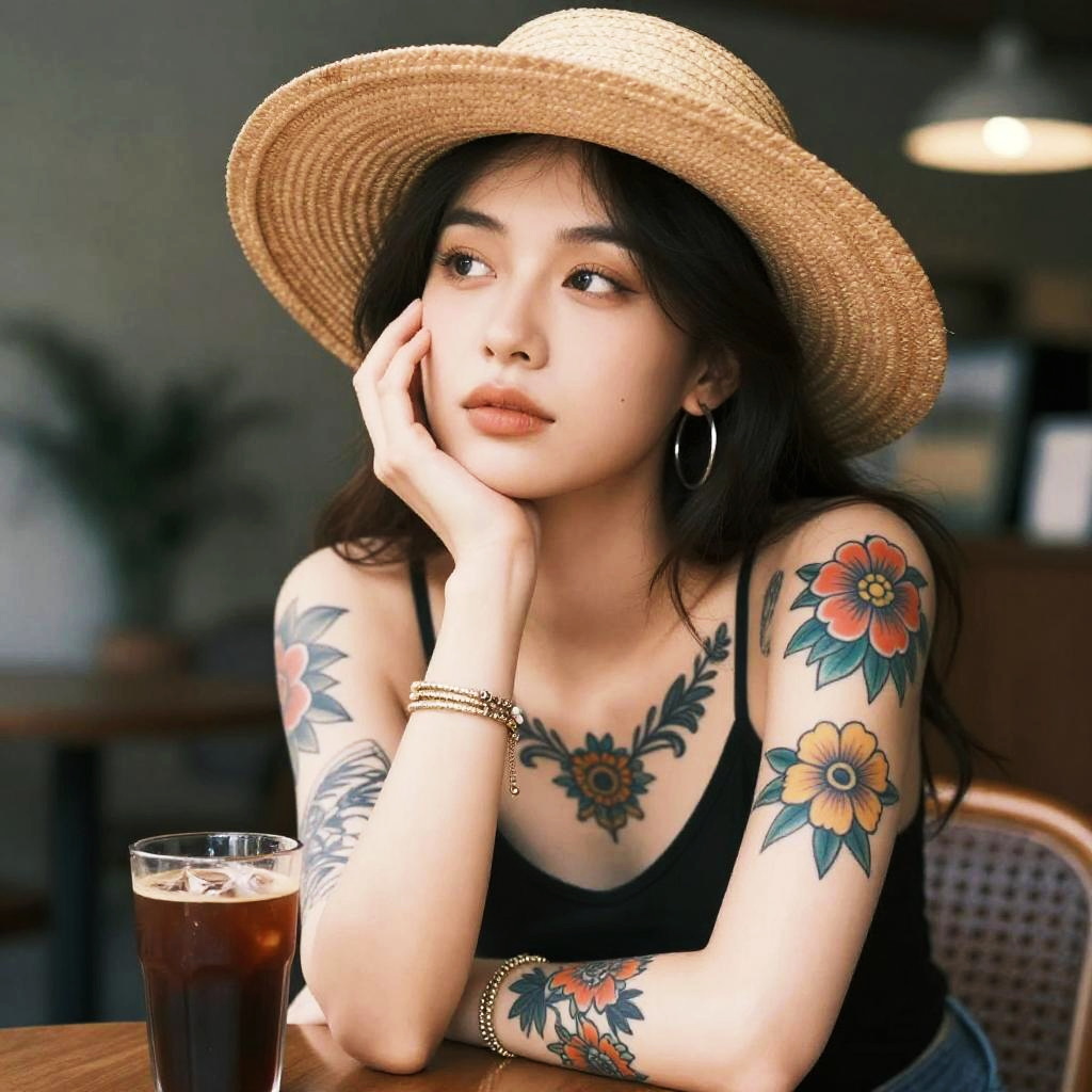 Photograph of a tattooed woman with fair skin and dark hair, wearing a wide-brimmed straw hat and hoop earrings. She's resting her chin on her hand, looking to the side with a calm expression. Her arms are covered in colorful tattoos featuring flowers and other designs. She's dressed in a black, spaghetti-strap top and has multiple bracelets on her wrist. In front of her is a glass of iced coffee on a table. The background is blurred, with hints of an indoor setting.