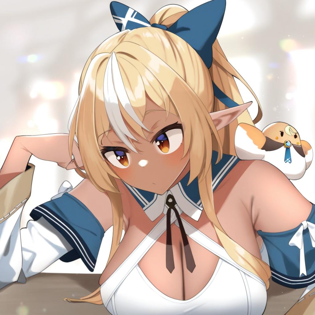 Elfriend (shiranui flare), hololive, 1girl, dark-skinned female, red eyes, orange eyes, streaked hair, blonde hair, long hair, white hair, sidelocks, ponytail, high ponytail, hair bow, large breasts, cleavage, white dress, blue bow, bare shoulders, detached sleeves, long sleeves, virtual youtuber, virtual youtuber, elf, bird, dark elf, by artist sasanon (sasapoliton), leet