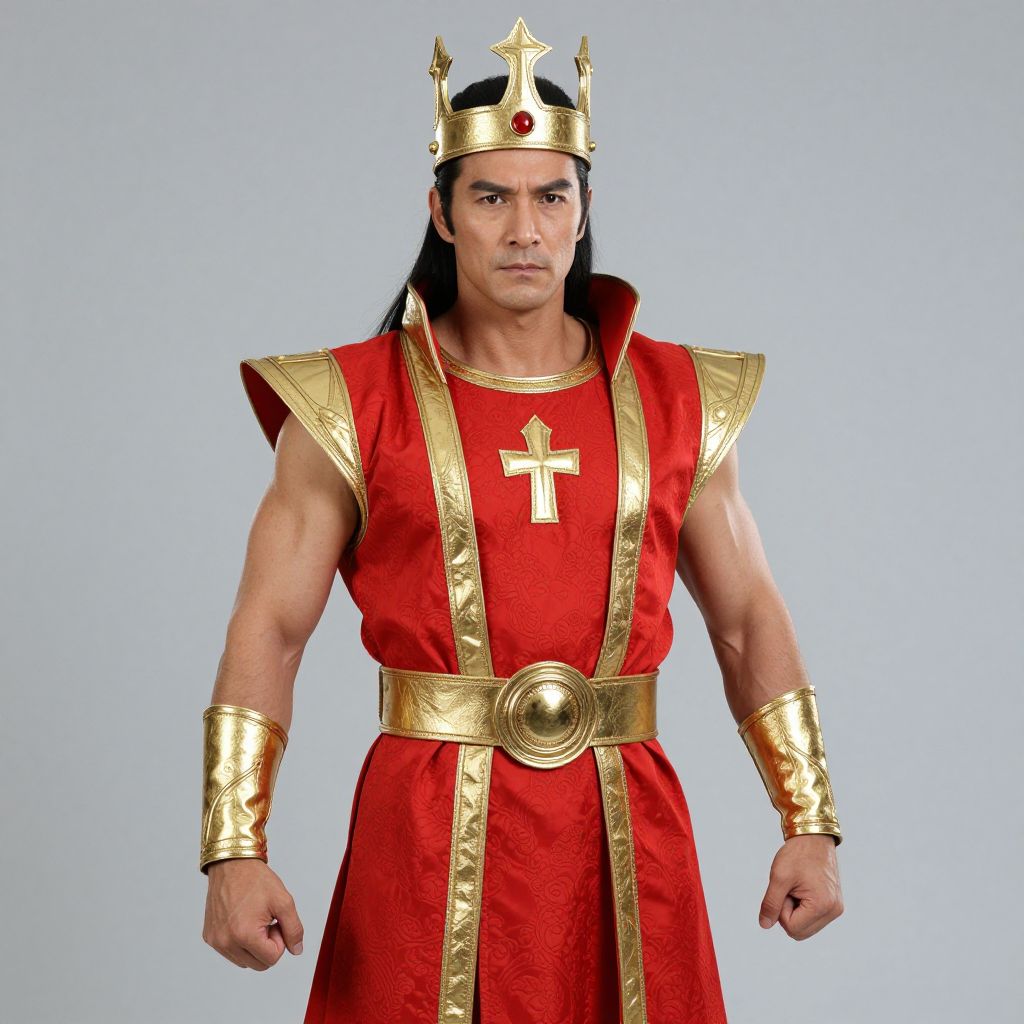Photograph of a muscular, dark-haired man in a red and gold royal costume with a crown, cross emblem, and gold armlets, standing against