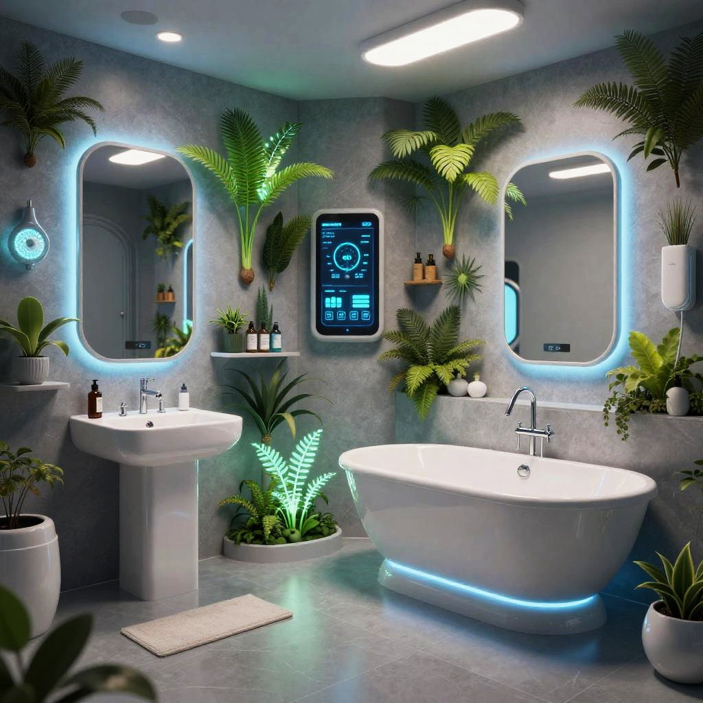 Sci fi bathroom with bioluminescent plants integrated in walls, advanced water recycling system, smart mirrors displaying health stats, futuristic tubs with levitation features