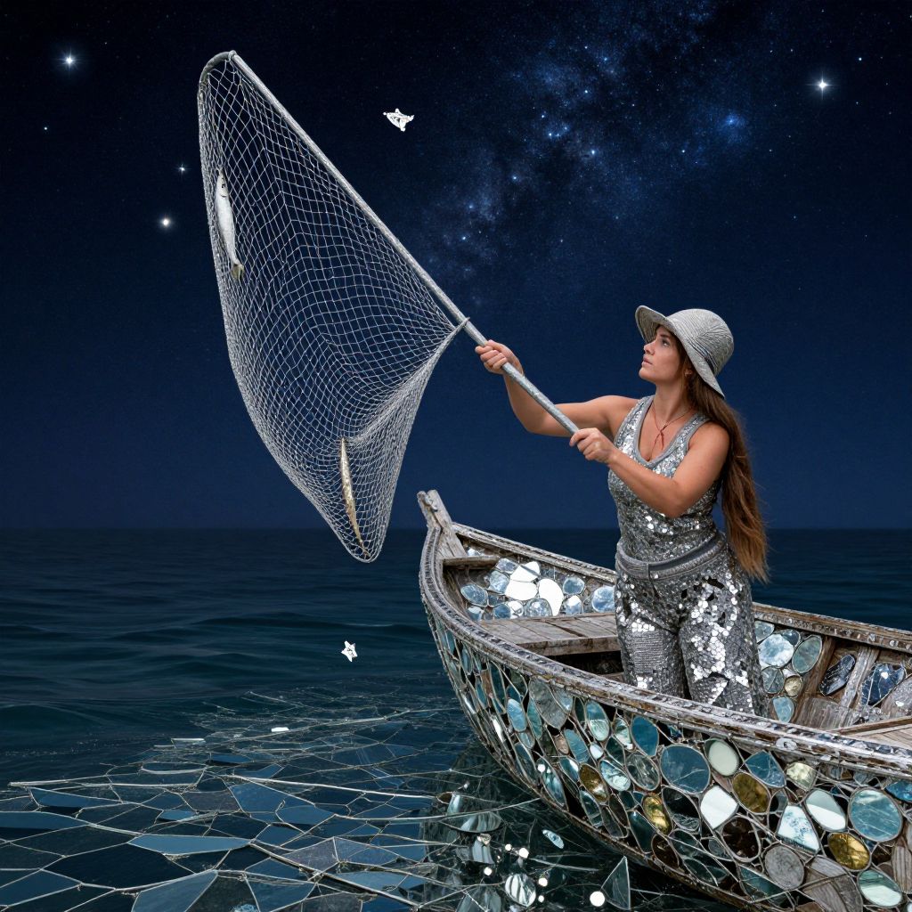 A fisherwoman navigates the celestial sea using a boat made from shattered mirrors, catching constellations in her silver net.