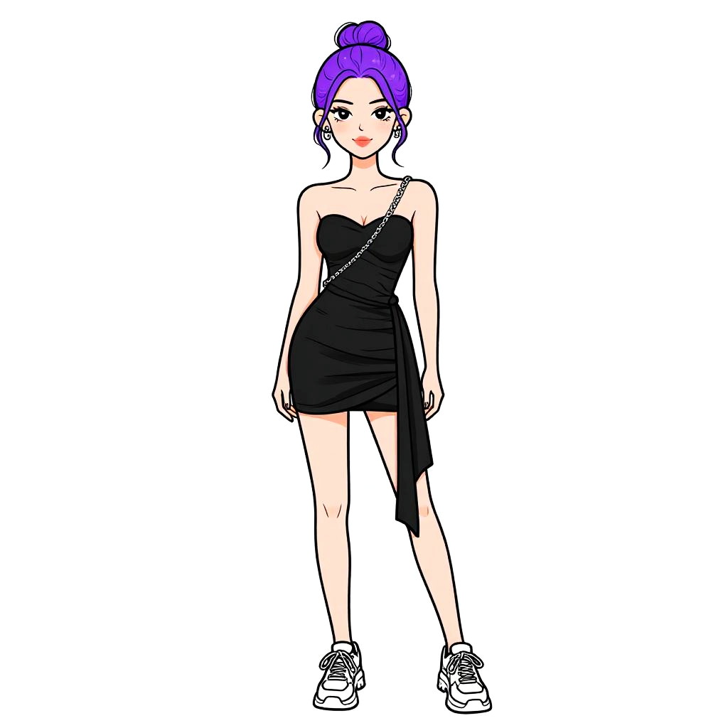 Woman with pretty face and pretty hair. smiling Woman, modern minimalist, black halter-neck skater dress, sleeveless, keyhole neckline, fitted bodice, flared skirt, above-knee length, plain fabric, invisible back zipper, white plain studio background. --sref 1461