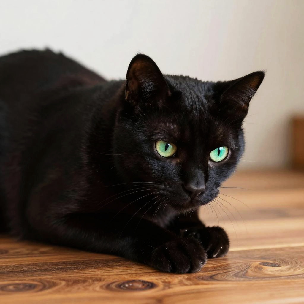 Photograph of a sleek, black cat lying on a wooden floor. The cat has bright, luminous green eyes that stand out against its dark fur. Its ears are perked up, and it gazes intently to the right. The wooden floor has a natural, warm brown tone with visible grain patterns. The background is blurred, featuring a white wall and a hint of brown furniture in the distance. The cat's fur is glossy and well-groomed, giving it a healthy and alert appearance. The lighting is natural, highlighting the cat's eyes and the texture of the floor.