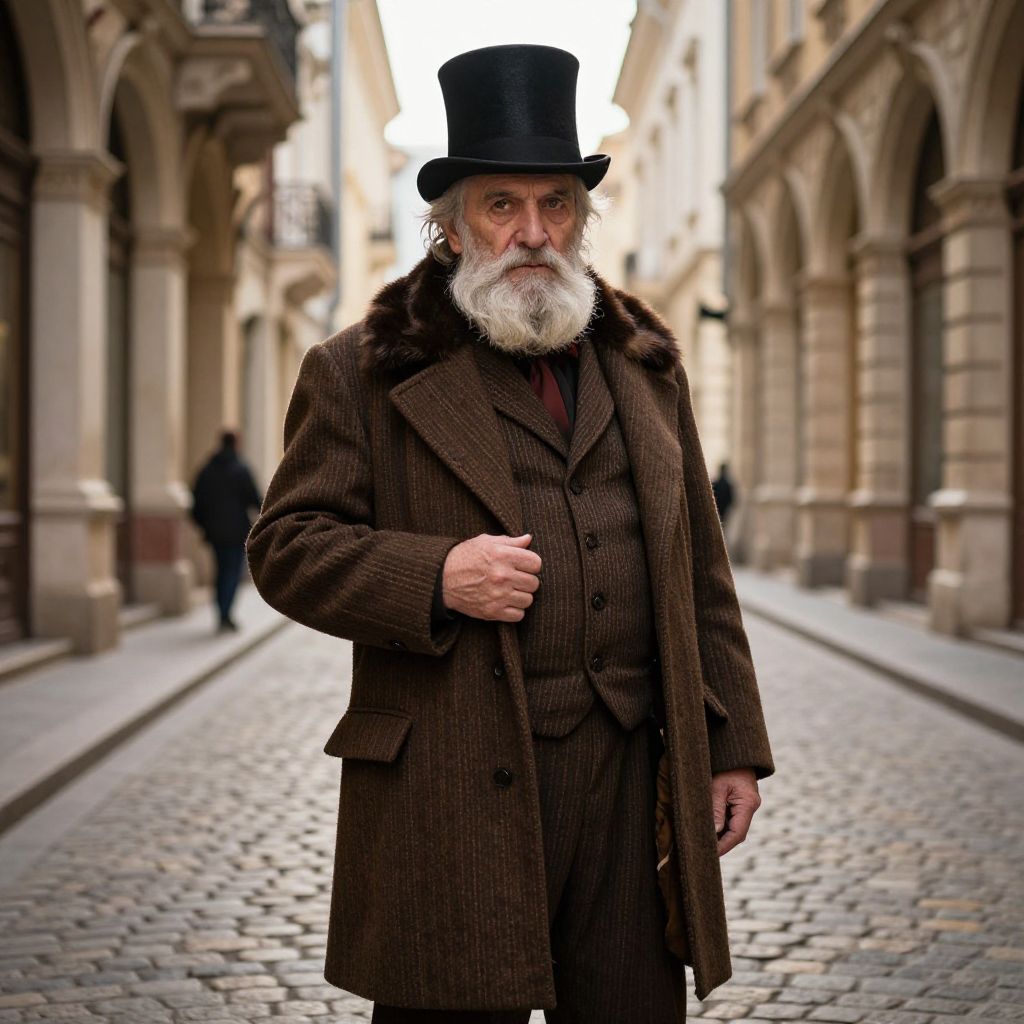An old man with a long white beard and a full gray mustache, wearing a classic green and brown woolen coat with a fitted waistcoat, a white lace collar that adds a refined, elegant touch, standing in a sun-dappled garden with a wooden chair nearby. His eyes are gentle and kind, with a warm, thoughtful expression, as he gazes slightly off into the distance, suggesting wisdom and quiet reflection. The scene is softly lit by golden afternoon sunlight, with blooming flowers and a few trees in the background, evoking a timeless, nostalgic atmosphere.