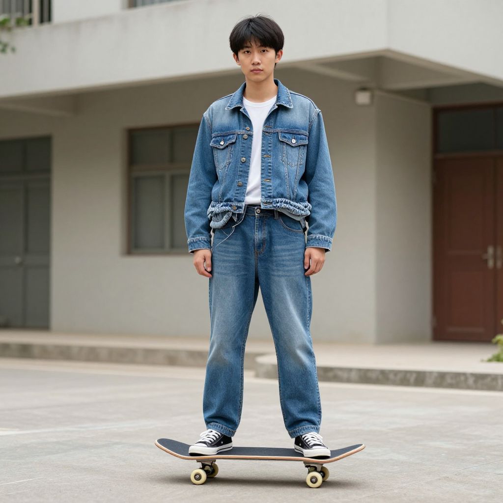 Photograph of an Asian teenage boy with short black hair, wearing a blue denim jacket and pants, white tee, and black sneakers, standing on a