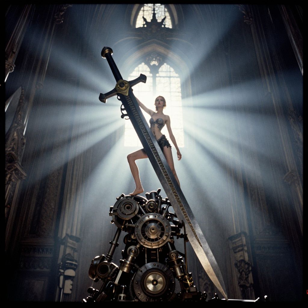 Analog film photo art by Zdzislaw Beksinski, baroque style, gothic, skinny woman, mechanical, giant cyberpunk sword, epic, glorification, backlit, god rays, aiai-Glimra, faded film, desaturated, 35mm photo, grainy, vignette, vintage, Kodachrome, Lomography, stained, found footage