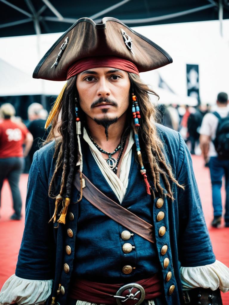 Man in Jack Sparrow Costume, cosplay festival photo, photorealistic realism