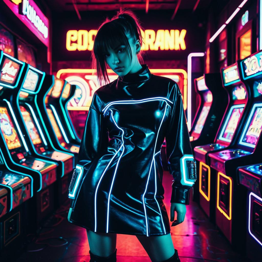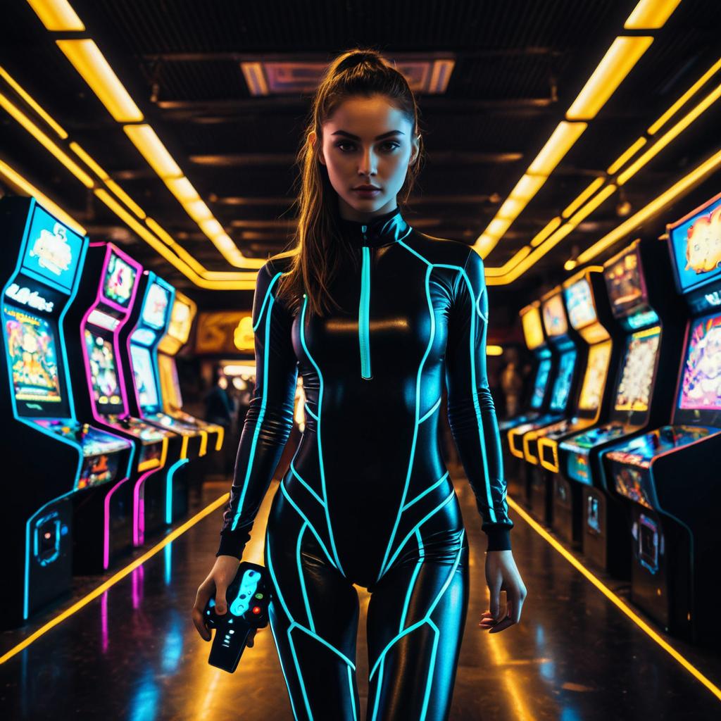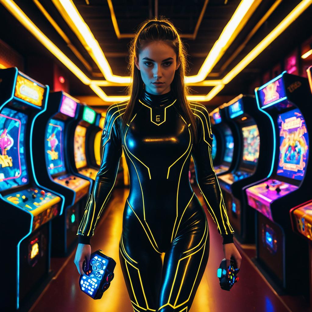 Hyper-realistic dark dramatic portrait of a young female cyber athlete in form-fitting neon bodysuit, carrying a holographic gaming controller, strutting along a futuristic arcade, golden ambient lighting, mystical, atmospheric, volumetric lighting, cinematic composition, photo-realistic