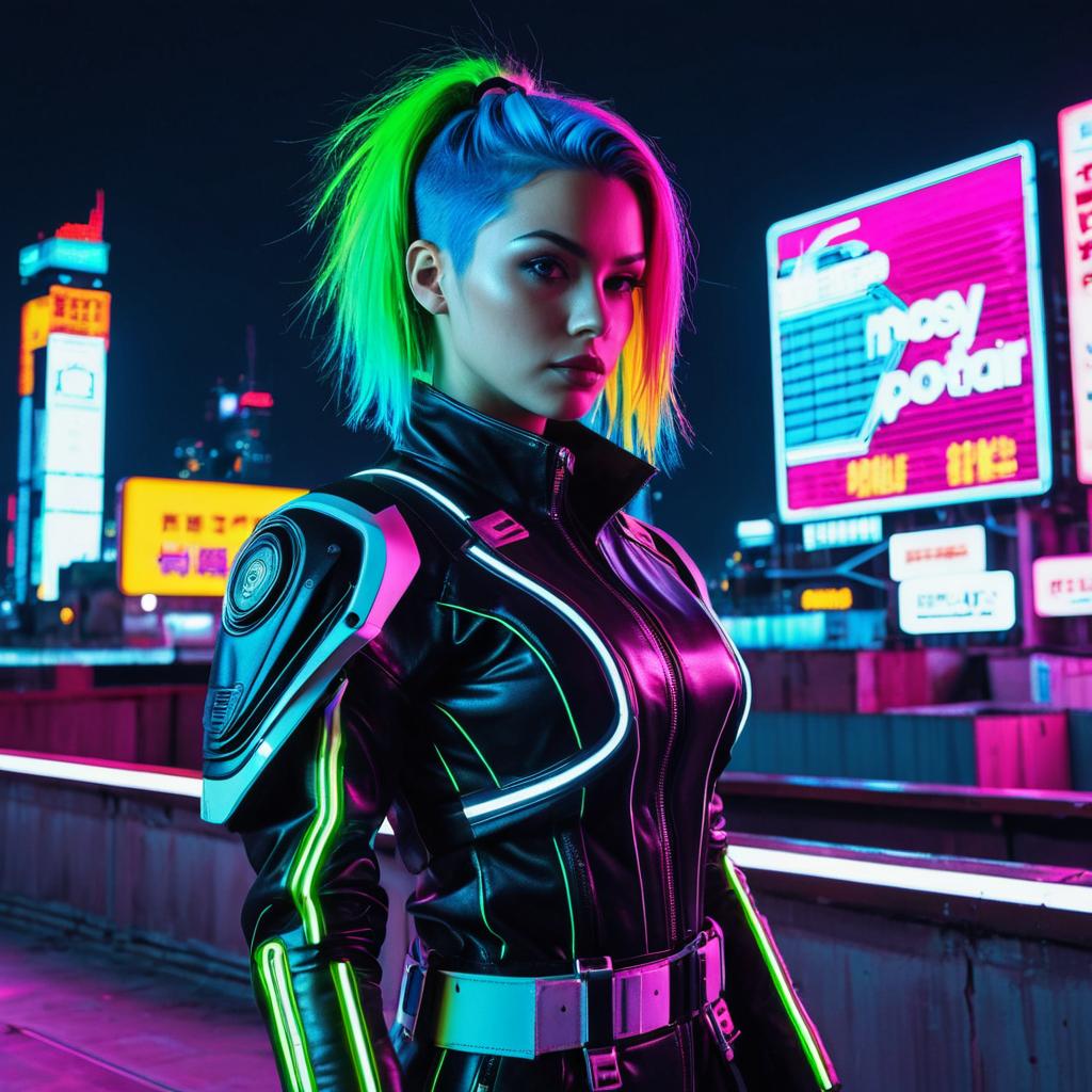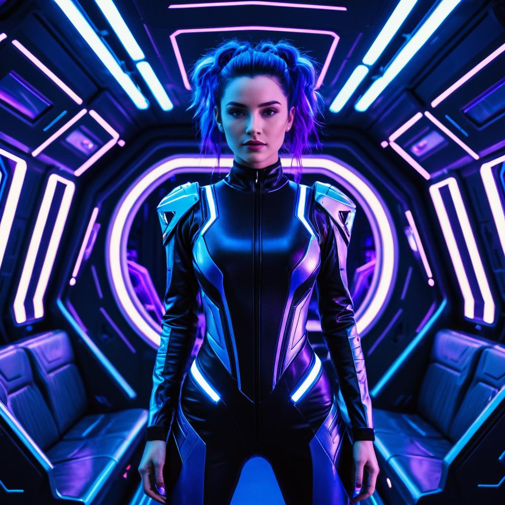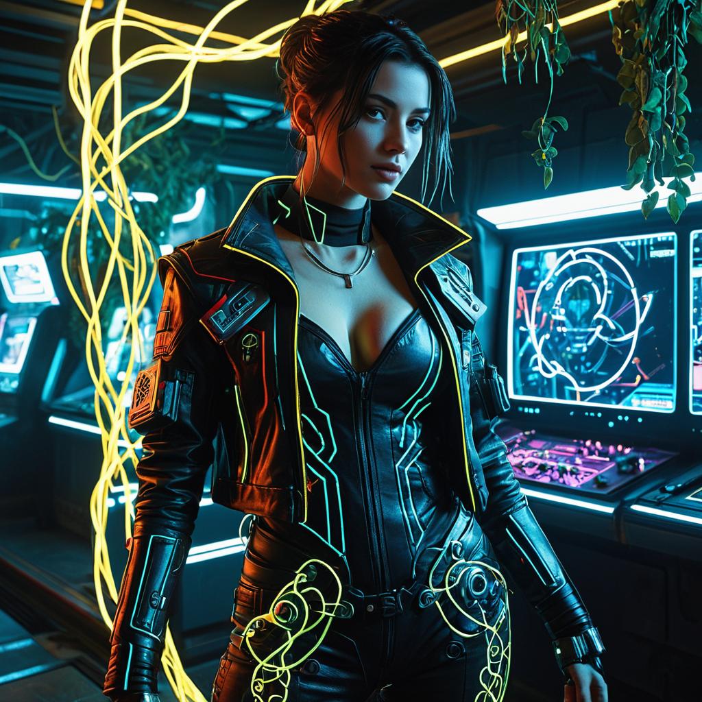 Hyper-realistic dark dramatic portrait of a young female cyber athlete in form-fitting neon bodysuit, carrying a holographic gaming controller, strutting along a futuristic arcade, golden ambient lighting, mystical, atmospheric, volumetric lighting, cinematic composition, photo-realistic