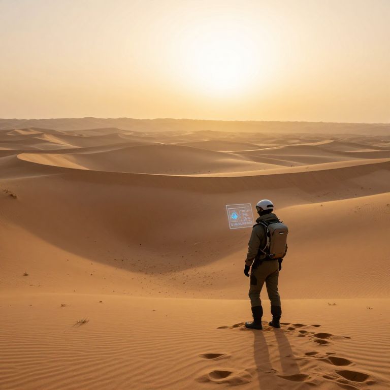 Photograph of a lone figure in a desert landscape, standing with their back to the camera. The person, wearing a white helmet, grey tactical vest, and dark pants, has a backpack and is holding a tablet displaying a blue icon. The desert is vast, with rolling, wind-swept sand dunes in shades of orange and brown. The bright sun is high in the sky, casting long shadows and illuminating the sand. The person’s footprints are visible in the sand, adding texture to the smooth, rippled surface. The overall scene evokes a sense of solitude and exploration.