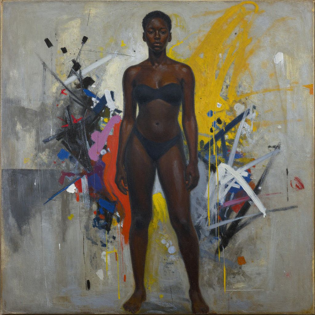 Photograph-style painting of a dark-skinned, topless woman with black bikini bottom, standing against a colorful abstract background with splashes of yellow,