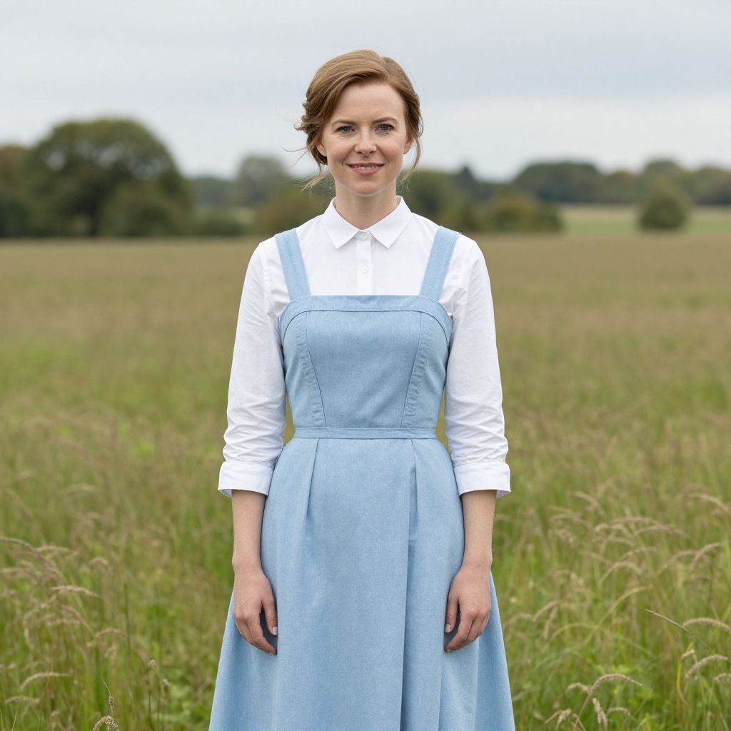 Photograph of a young woman standing in a lush, green field with tall grass. She has fair skin, light brown hair styled in a loose updo, and is smiling gently. She wears a white long-sleeved shirt under a light blue, knee-length pinafore dress with a fitted waist and button closure at the front. The background features a blurred, expansive field with trees in the distance under a cloudy sky. The image has a soft, natural light that highlights her serene expression and the simplicity of her attire.