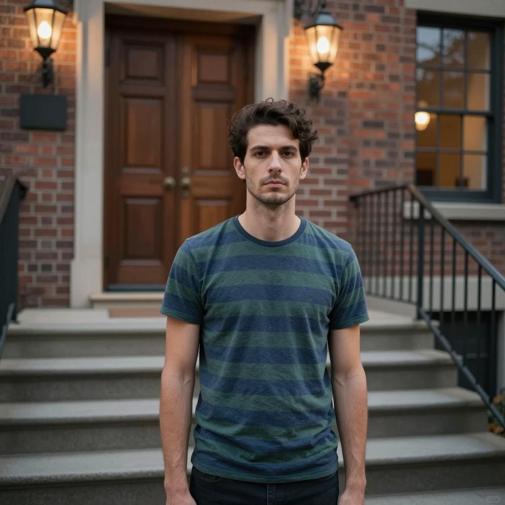 Man with short dark hair, white t-shirt, plaid shorts, white socks, and white shoes, sitting on a white wooden beam in an industrial-style ceiling. Multicolored ribbons (red, yellow, purple) hang diagonally across the ceiling. Exposed white beams and ductwork in background. Overhead light fixture on the left. Man's legs are crossed, arms rest on the beam.