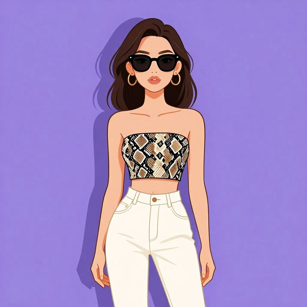 Digital illustration of a woman with dark hair, black sunglasses, hoop earrings, snake-print tube top, and white high-waisted pants against a purple