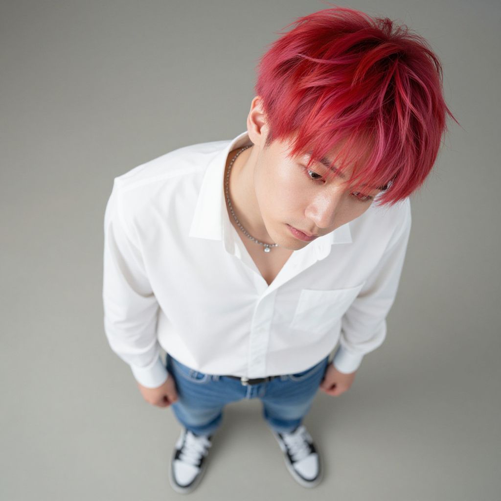 Man with red and pink hair wearing a white shirt and blue jeans. He has a necklace around his neck and is wearing black and white sneakers.